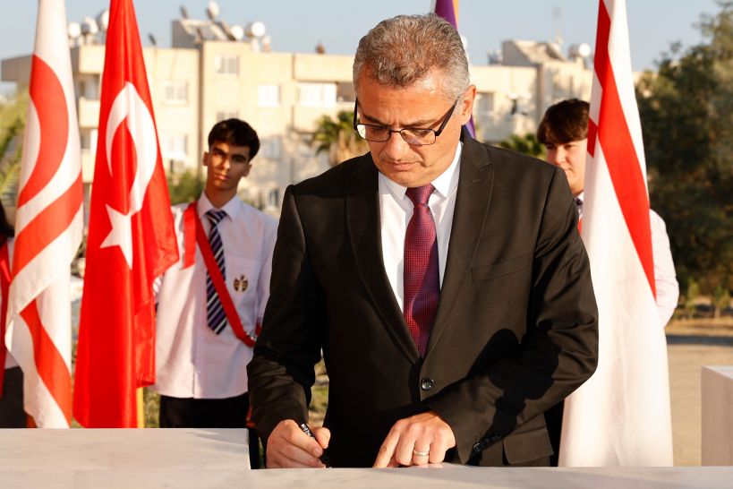Anıta çelenk sunulmasıyla başlayan törende, saygı duruşu ve İstiklâl Marşı eşliğinde bayrakların göndere çekilmesinin ardından Cumhurbaşkanı Tufan Erhürman Anıt Özel Defteri