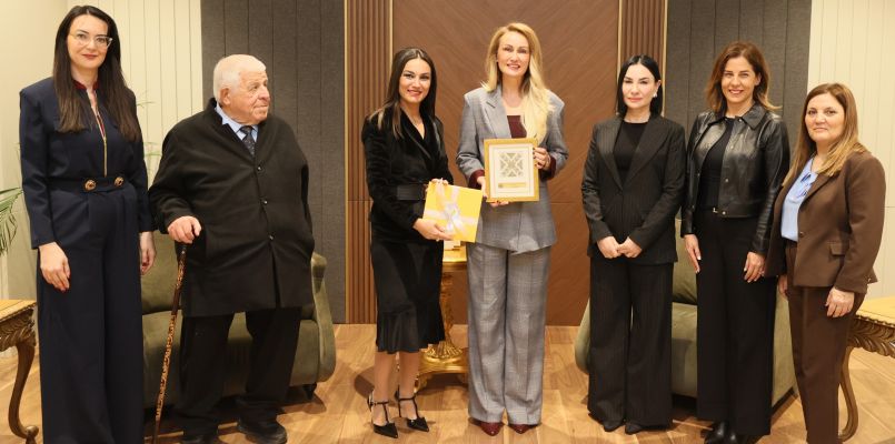 Ziyaret anısına hediye takdimi yapılan görüşmede, Cumhurbaşkanlığı Sosyal Hizmetler ve Sosyal Politikalar Danışmanı Aydan Başkurt yer aldı.