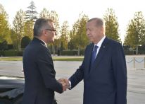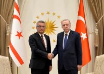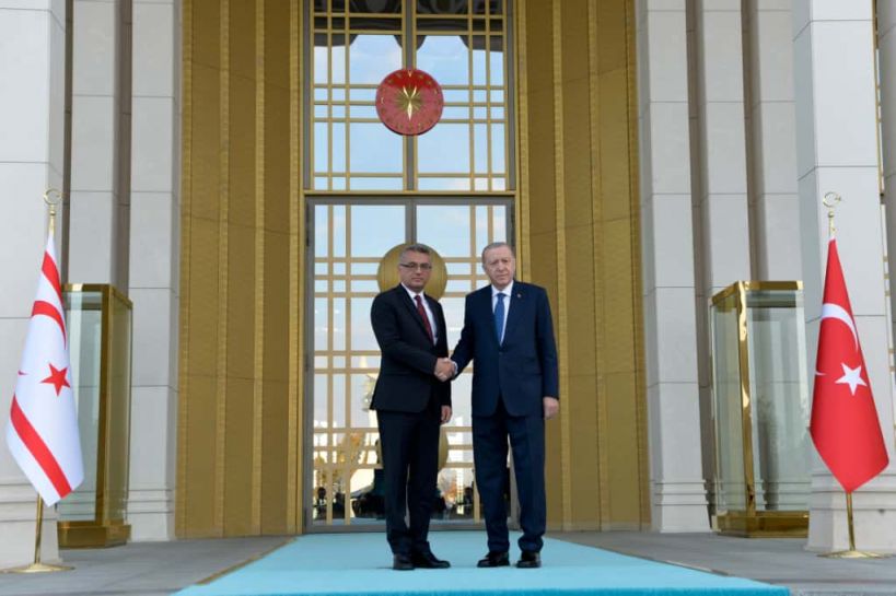 Ardından Türkiye Cumhuriyeti Cumhurbaşkanı Recep Tayyip Erdoğan, Erhürman’ı Cumhurbaşkanlığı Külliyesi'nin ana giriş kapısında karşıladı.