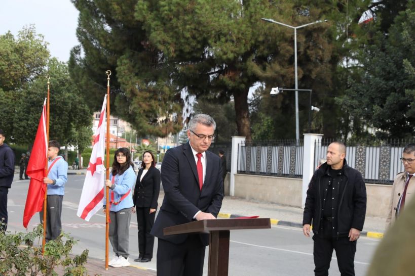 Anıta çelenk sunulmasıyla başlayan törende, saygı duruşu ve İstiklâl Marşı eşliğinde bayrakların göndere çekilmesinin ardından Cumhurbaşkanı Tufan Erhürman Anıt Özel Defteri