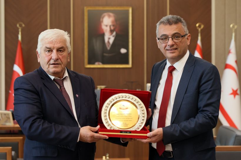 TÜRK-SEN Genel Başkanı Arslan Bıçaklı, Cumhurbaşkanı Tufan Erhürman’a görevinde başarılar diledi ve ziyaret anısına Cumhurbaşkanı Erhürman’a hediye takdimi yaptı.