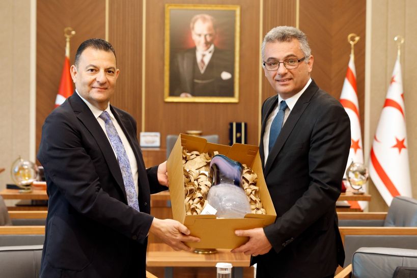 KÜB Başkanı Prof. Dr. Asım Vehbi Cumhurbaşkanı Erhürman’a görevinde başarılar diledi ve ziyaret anısına hediye takdim etti.