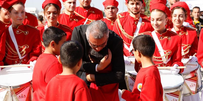 Ulu Önder Mustafa Kemal Atatürk, Kurucu Cumhurbaşkanı Rauf Raif Denktaş ve Kıbrıs Türk halkının varoluş ve özgürlük mücadelesi lideri Dr. Fazıl Küçük’ün yer aldığı bayrakları da taşıyan öğrencileri, Cumhurbaşkanı Tufan Erhürman selamladı.