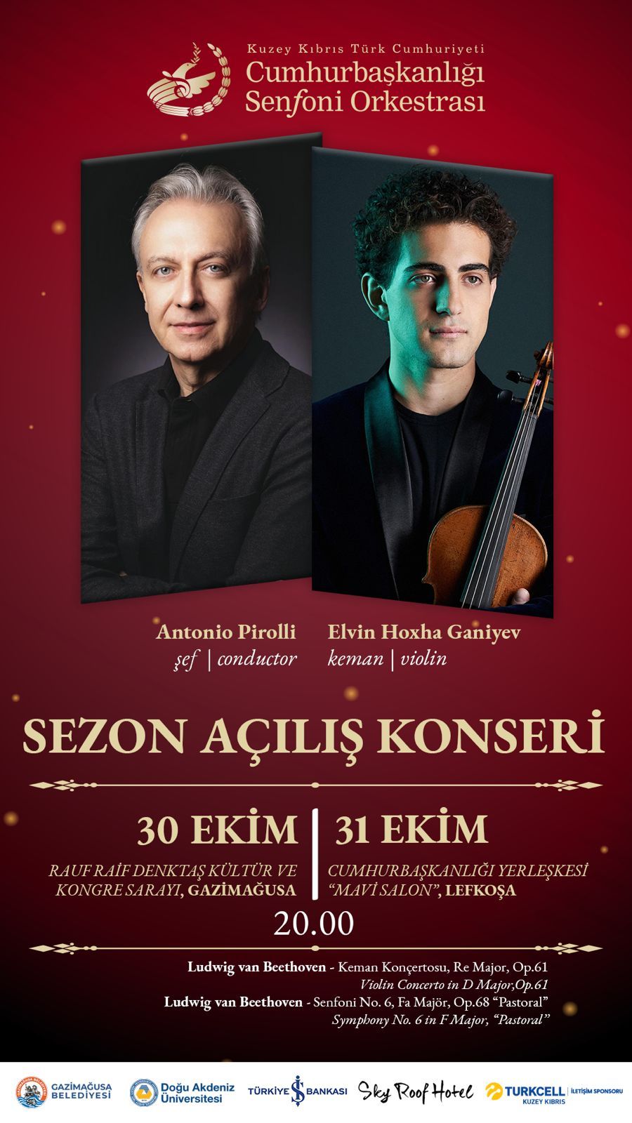 Orkestra şefi Antonio Pirolli yönetiminde ve keman sanatçısı Elvin Hoxha Ganiyev’in solist olarak katılımıyla gerçekleşecek olan Sezon Açılış Konserlerinin program kapsamında Ludwig van Beethoven’ın Keman Konçertosu Re Majör, Op. 61 ve Senfoni No.6 Fa Majör, Op. 68 “Pastoral” eserleri yer alacaktır.