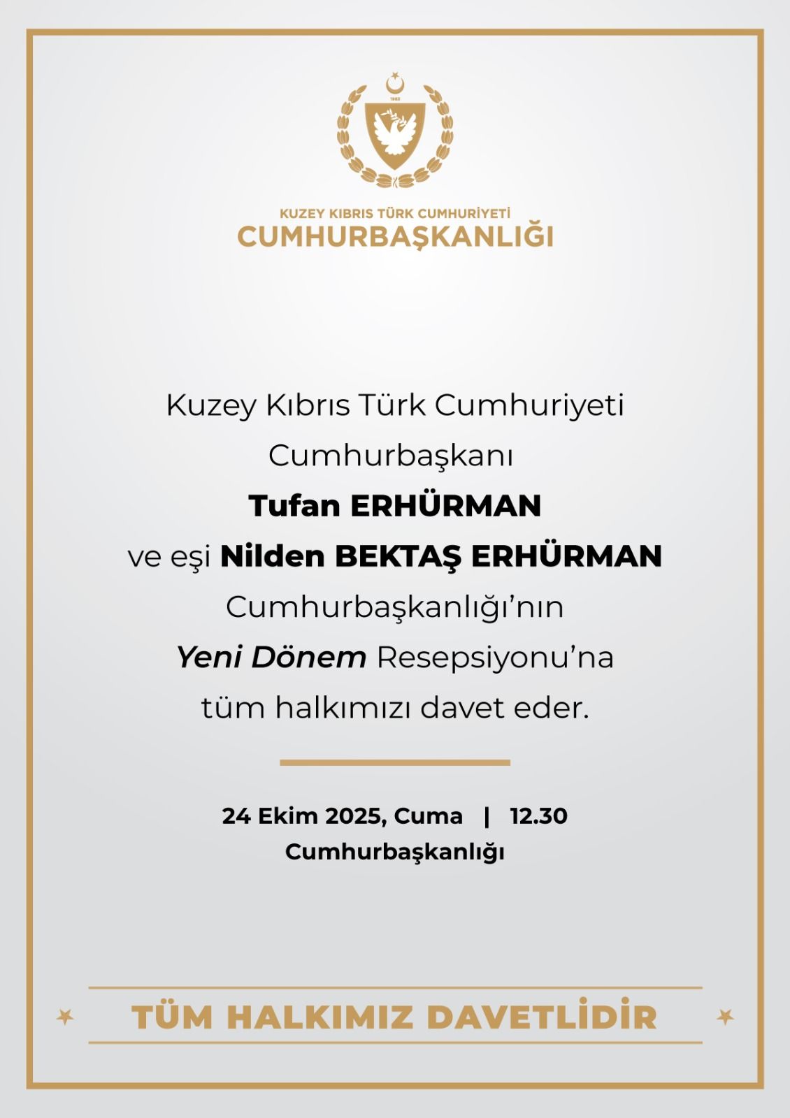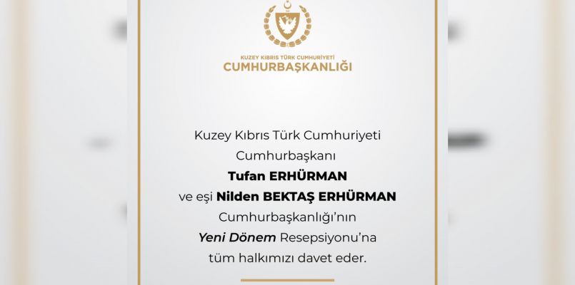 Kuzey Kıbrıs Türk Cumhuriyeti Cumhurbaşkanı Tufan ERHÜRMAN ve eşi Nilden BEKTAŞ ERHÜRMAN Cumhurbaşkanlığı'nın Yeni Dönem Resepsiyonu'na tüm halkımızı davet eder